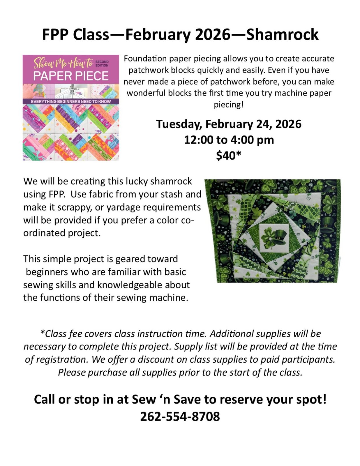 | Skill Details: | Confident Beginner. Completion of a beginning Foundation Paper Piecing Class recommended. |