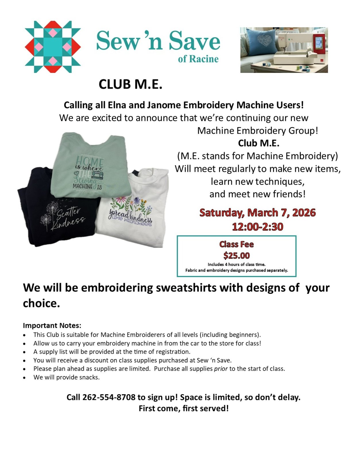 Calling all Elna and Janome embroidery machine users! Please join us for our next Embroidery Club ME. The class will be held from 10 am - 2 pm. Choose which day is best for you since the class topic and instruction is the same for both days.